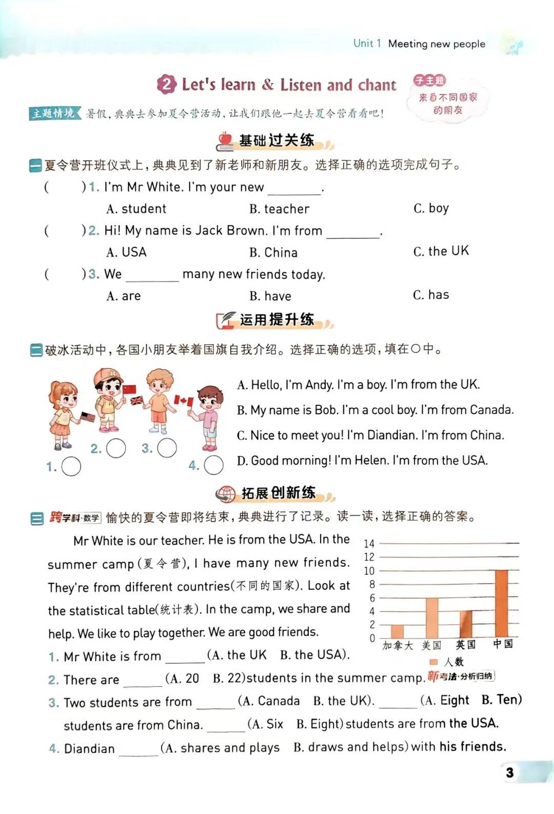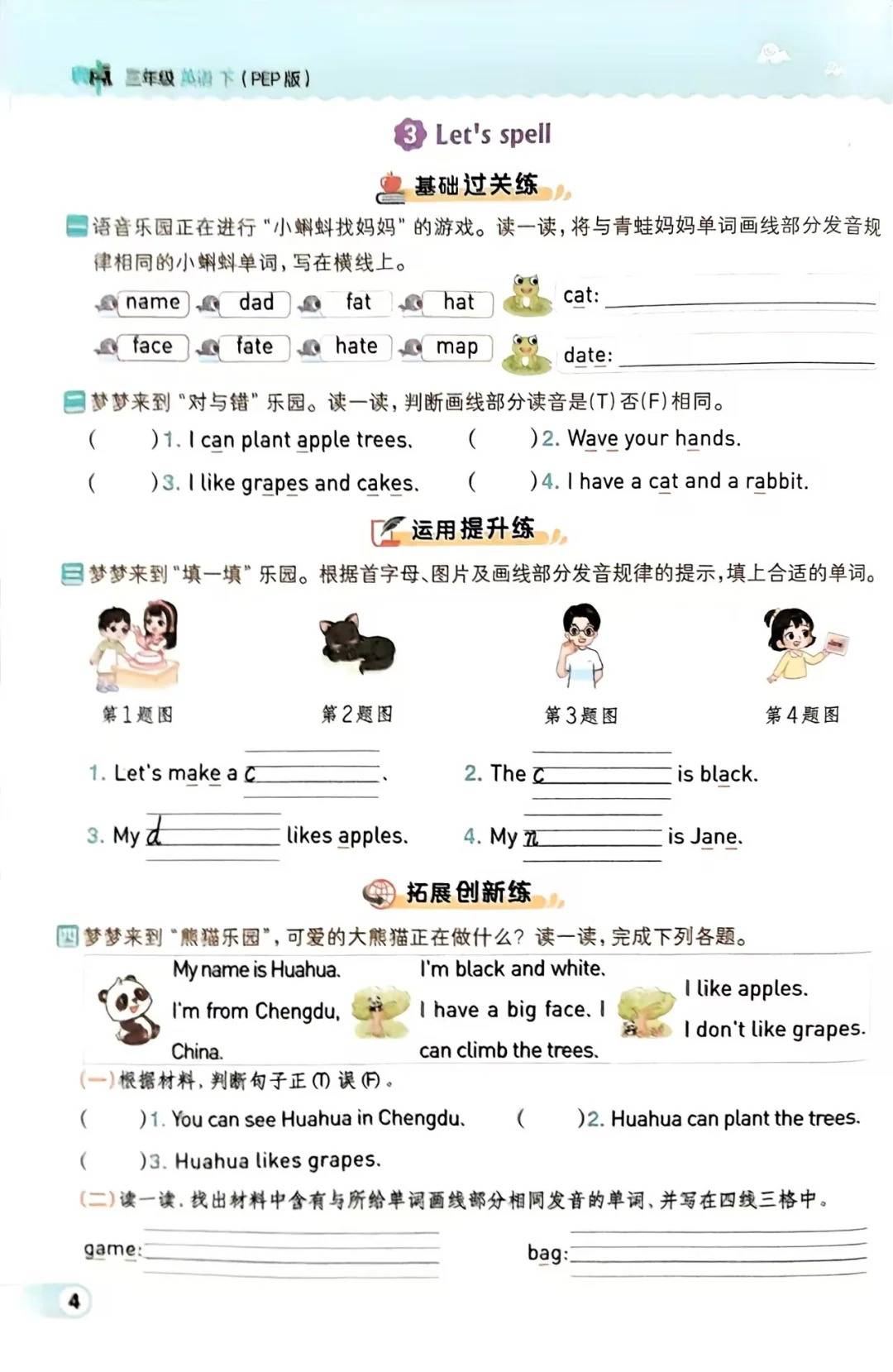 在知识积累上,系统呈现单元重点语音、单词、短语和句型,帮助学生构建扎实的英语基础,扩大词汇量,掌握基本语言表达。在能力培养方面,多样化的练习题型,从基础的词汇句型选择到拓展创新的阅读判断,锻炼学生的语言运用、阅读理解和思维能力,提升综合语言素养。主题情境的设置使学习更贴近生活,增强学生的学习兴趣和实际运用能力。文化意识、思维品质和学习能力等方面的引导,有助于学生全面发展英语学习能力,培养与他人交流沟通的意愿和主动思考解决问题的能力,为后续英语学习奠定良好基础。