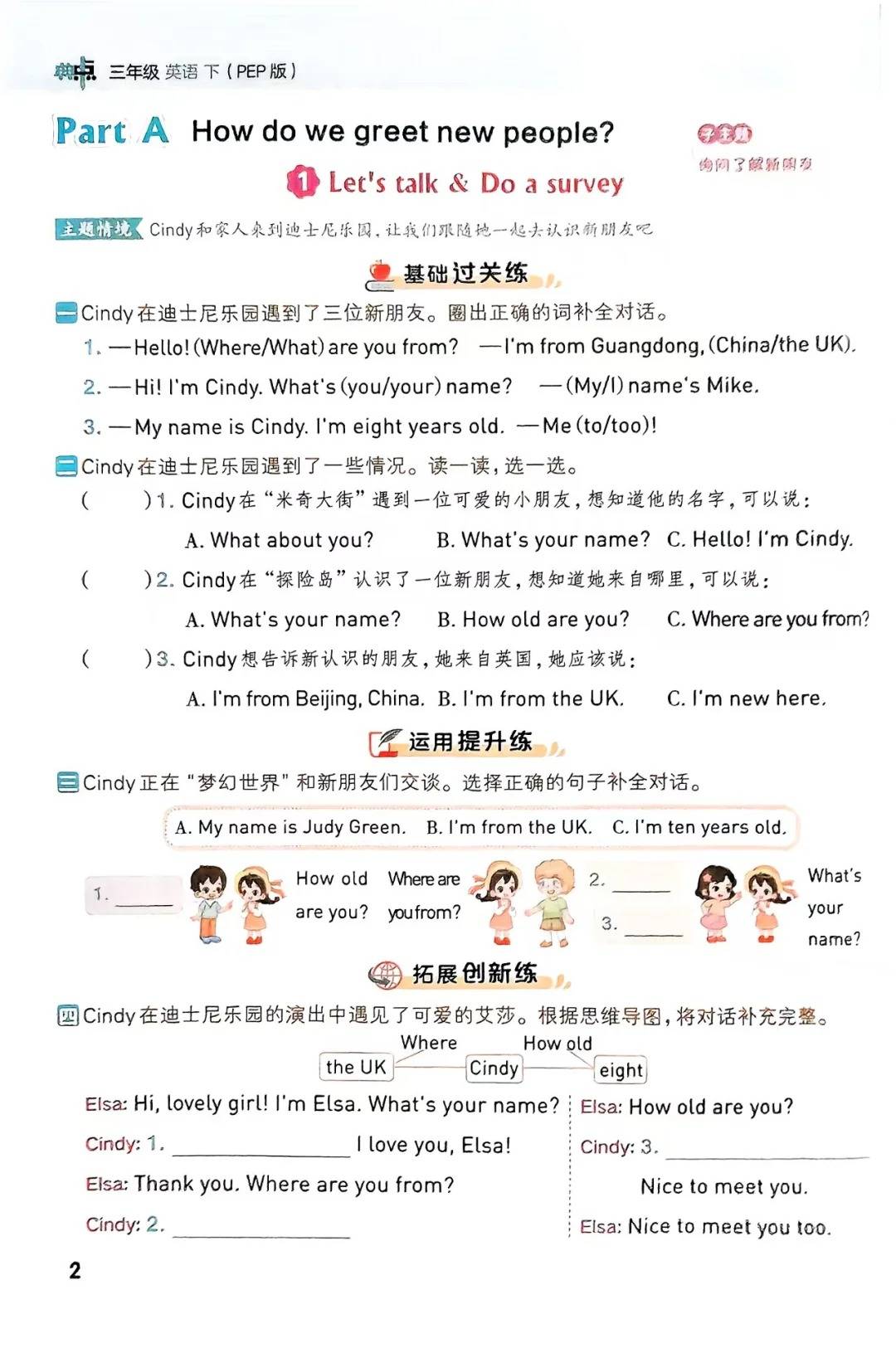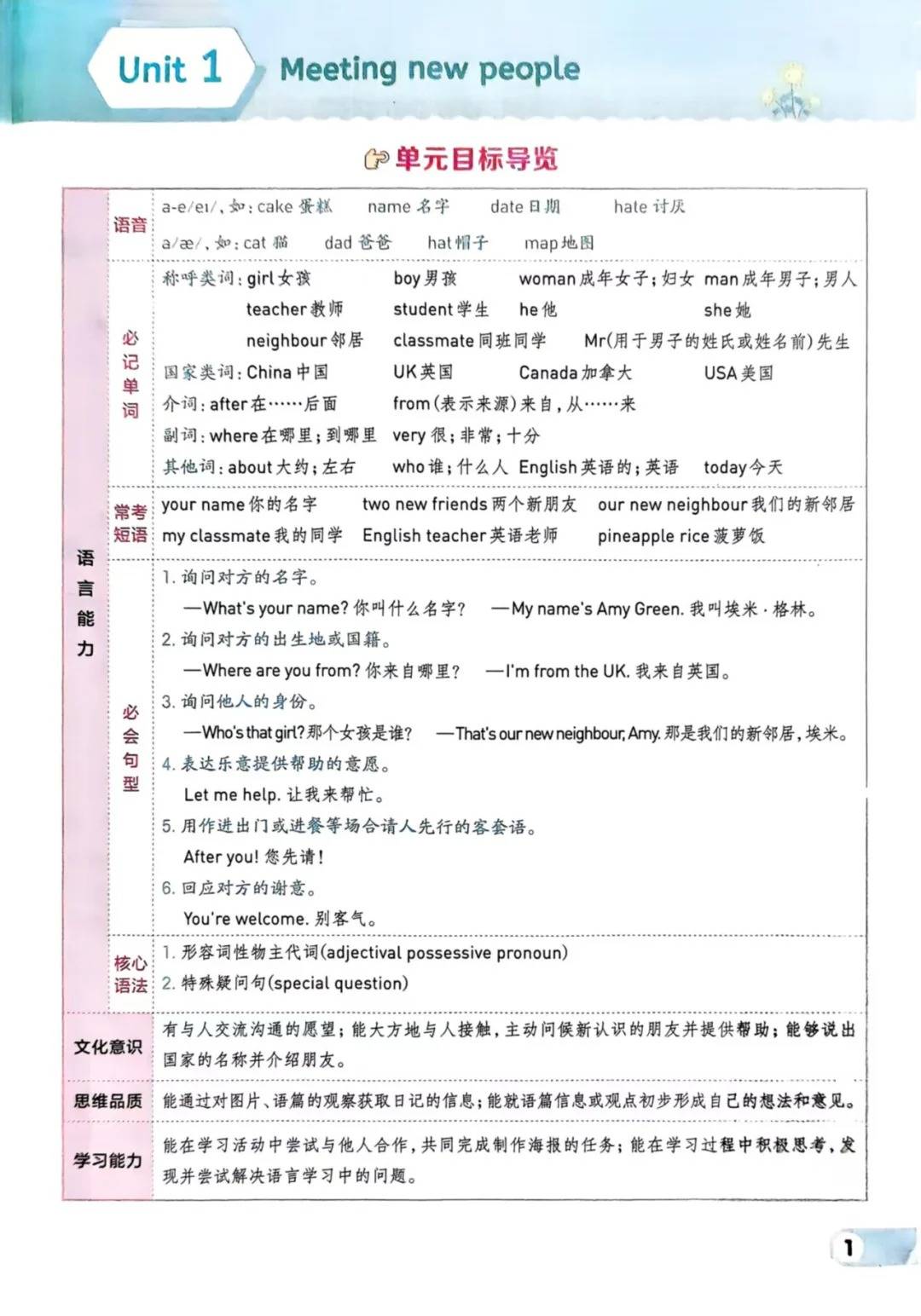 这是一份三年级英语下册(PEP 版)Unit 1 “Meeting new people” 的学习资料。资料以单元目标导览开篇,涵盖语音(如 a - e/ei/ 和 a/æ/ 的发音示例 )、必记单词(包括称呼类、国家类等 )、常考短语、语言能力(必备句型,如询问姓名、国籍等 )、核心语法(形容词性物主代词、特殊疑问句 )、文化意识、思维品质和学习能力等内容。之后围绕 Part A “How do we greet new people” 等板块设置基础过关、运用提升、拓展创新等练习,通过迪士尼乐园、夏令营等主题情境,考查单词、句型运用及语音知识。关键词:三年级英语下册、PEP 版、Unit 1、英语学习资料、必记单词、必备句型