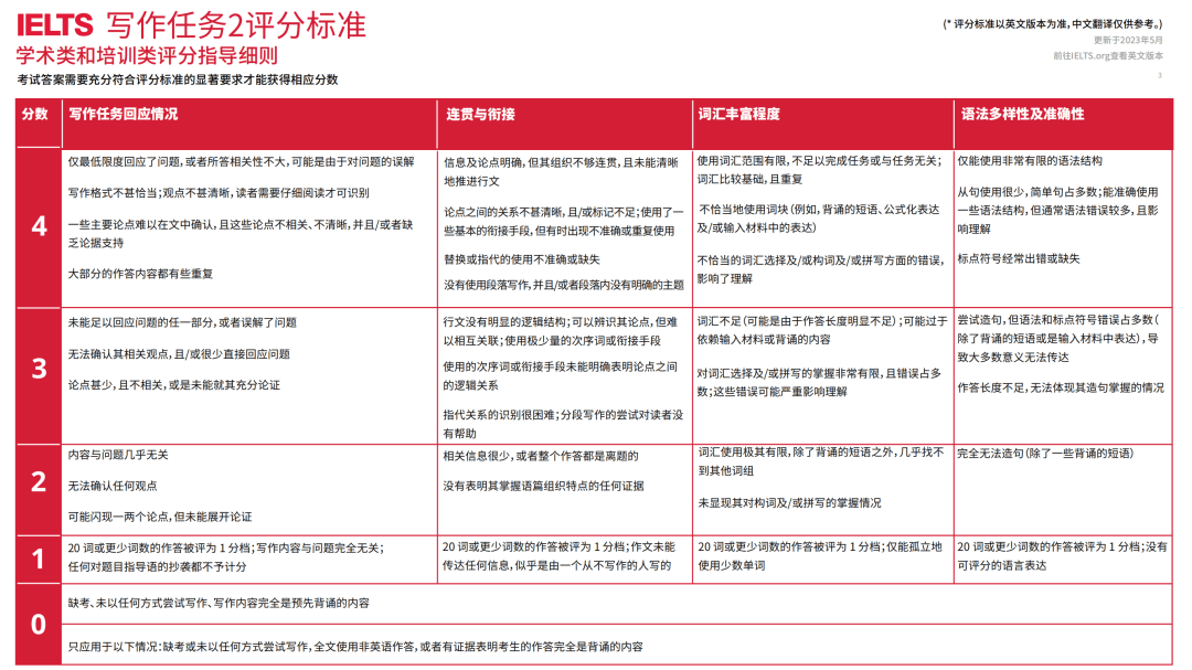 除了大家熟知的写作任务回应情况、连贯与衔接、词汇丰富程度、语法多样性及准确性四大评分项外,雅思写作还有隐藏扣分项,如字数不足 、偏题, 字数不足会直接影响得分。