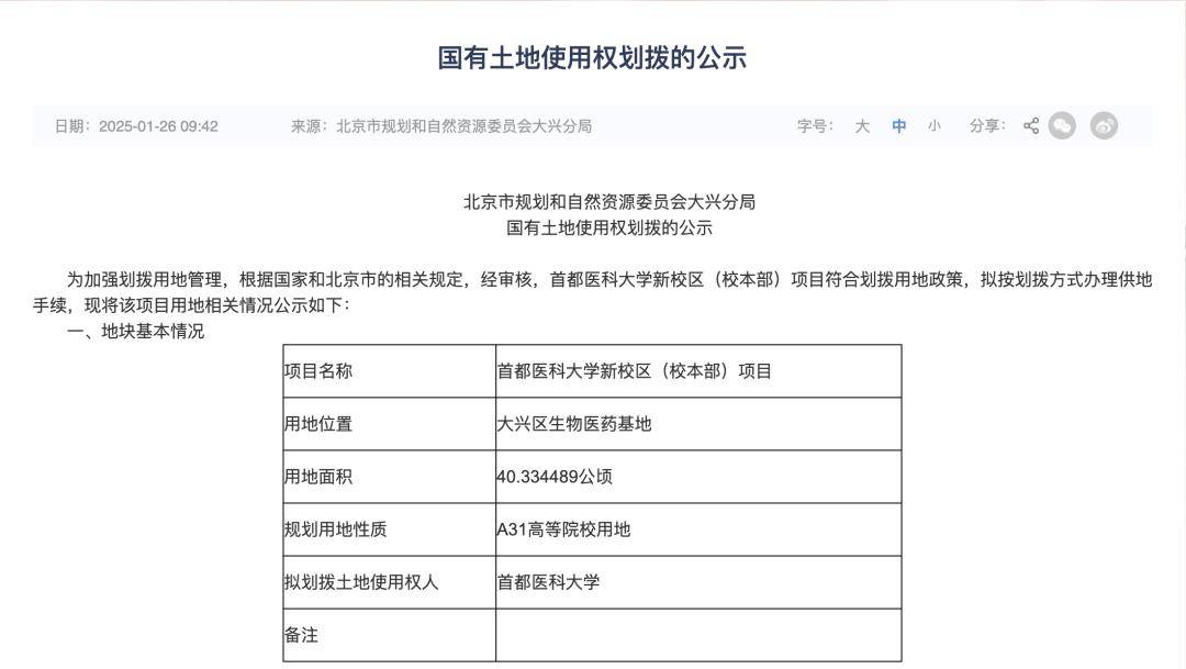 据悉,新校区建成后,首都医科大学将腾退现有五个校区,实现“一校一址”办学。