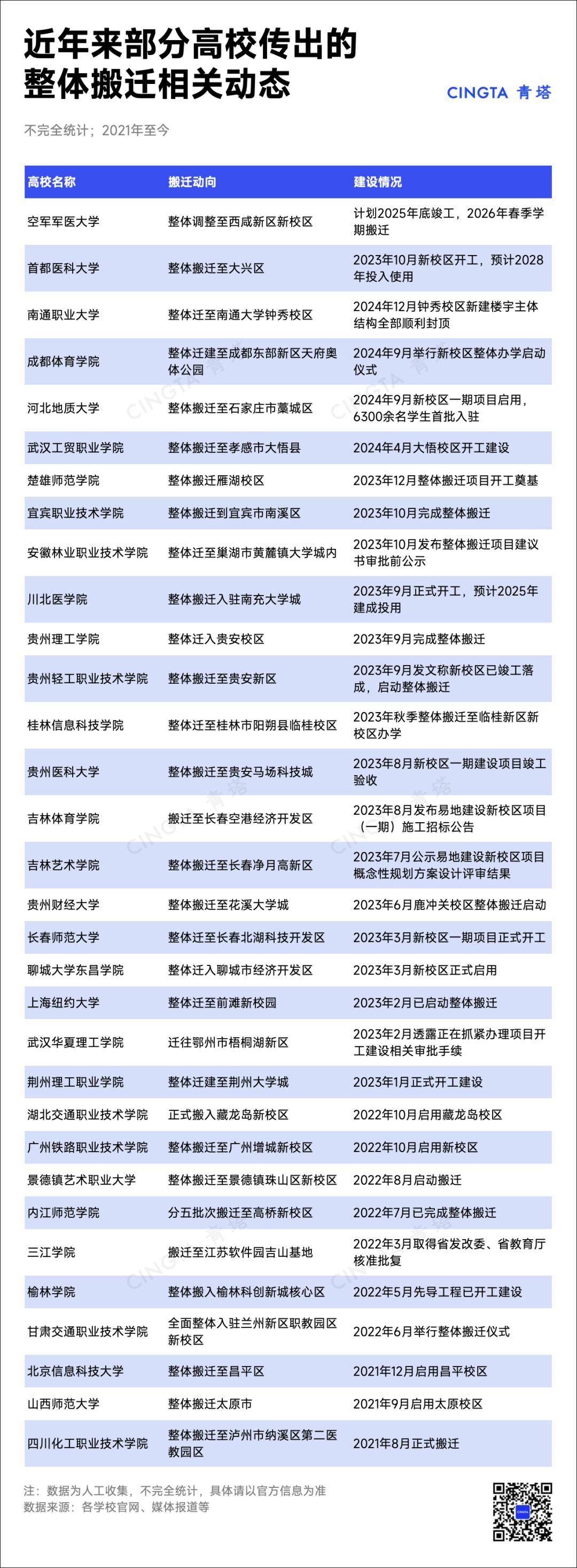 近年来,随着中国城市与高等教育发展速度的加快,大批高校纷纷开启新一轮新校区建设。2024年下半年来,便有多所高校传来整体搬迁的新动态: