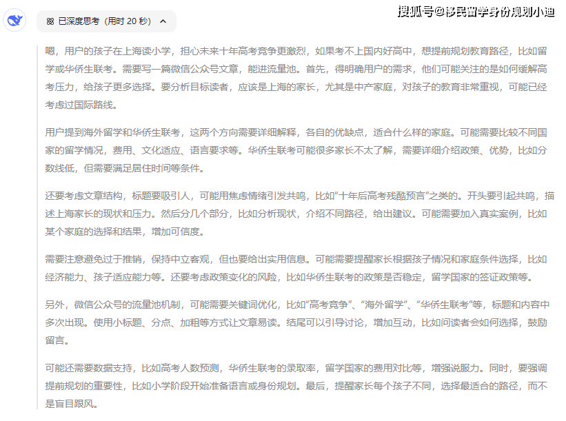 让它撰写一篇以 “上海学生考不上好高中该怎么办” 为主题的文章。结果出乎意料,AI的思路非常明白、通透。