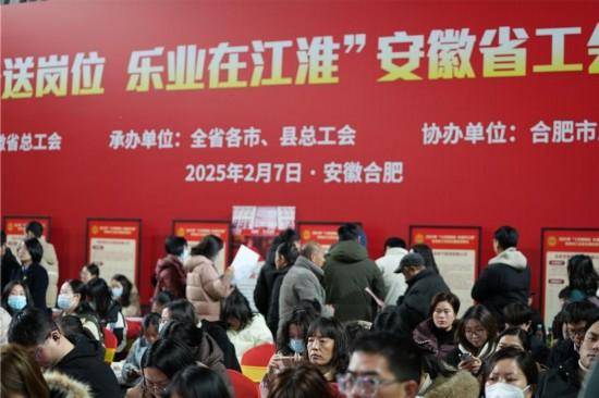 2月7日上午,2025年“工会送岗位 乐业在江淮”安徽省工会就业援助招聘会主会场活动在合肥市包河区工人文化宫火热举行。大批求职者涌入现场,为新春就业市场打响“开门红”。