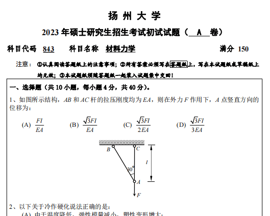 2023年扬州大学843材料力学考研真题试卷与手写答案