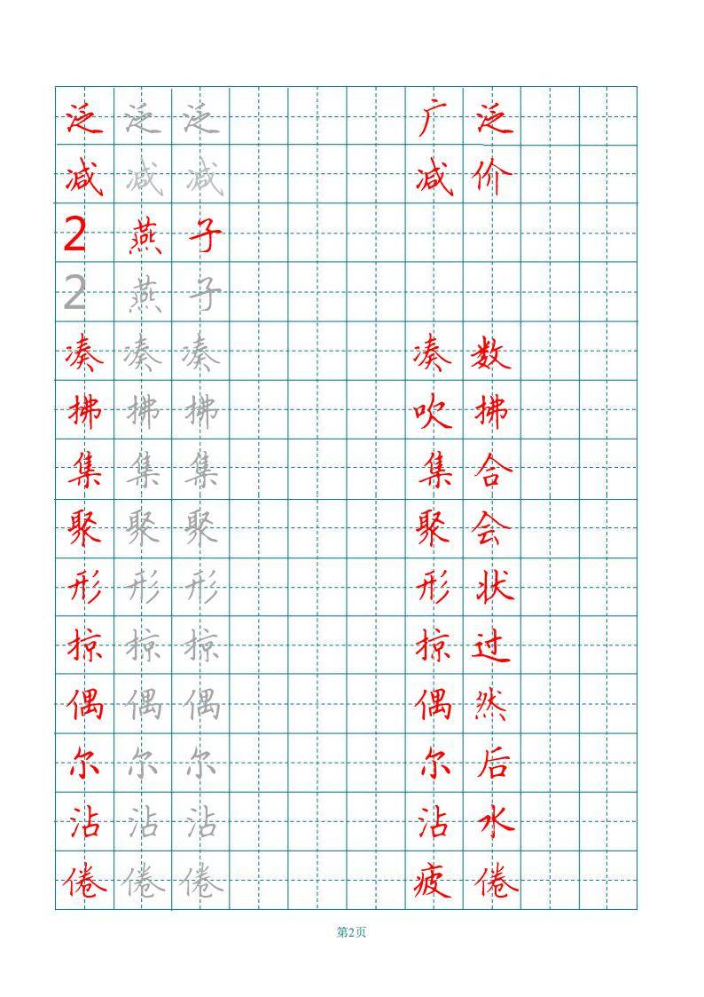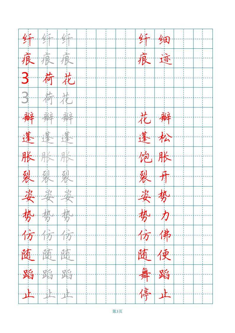 这是一份统编语文三年级下册的生字练字帖,按照课文顺序编排。练字帖针对每篇课文后的写字表生字,提供了规范的书写范例,如 “古诗三首” 中的 “融、燕、鸳、鸯” 等,“燕子” 中的 “凑、拂、集、聚” 等,每个生字多次书写练习,并在右侧给出了包含该生字的常见词语,辅助学生理解和记忆。关键词:统编语文、三年级下册、生字练字帖、书写练习