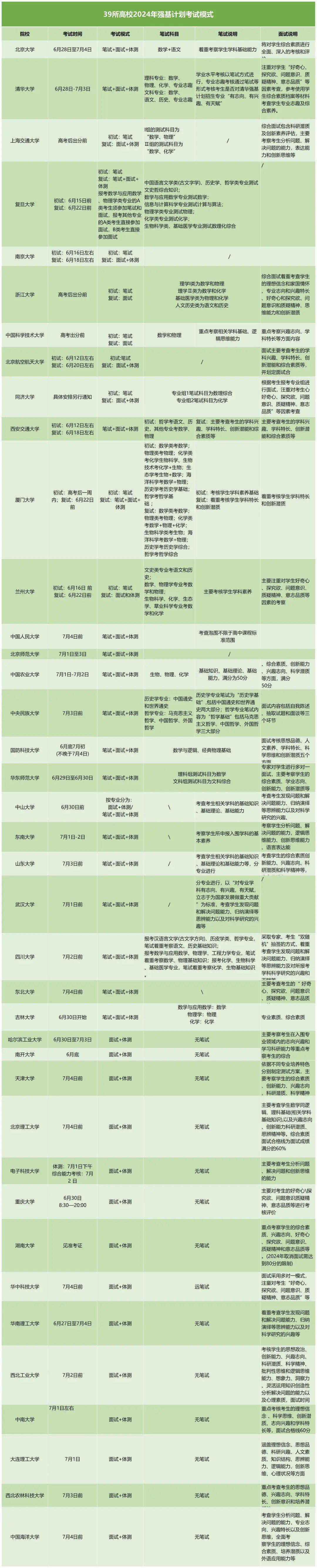 2024年39所强基计划试点高校校测考试方式和校测时间一览: