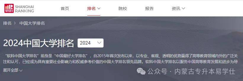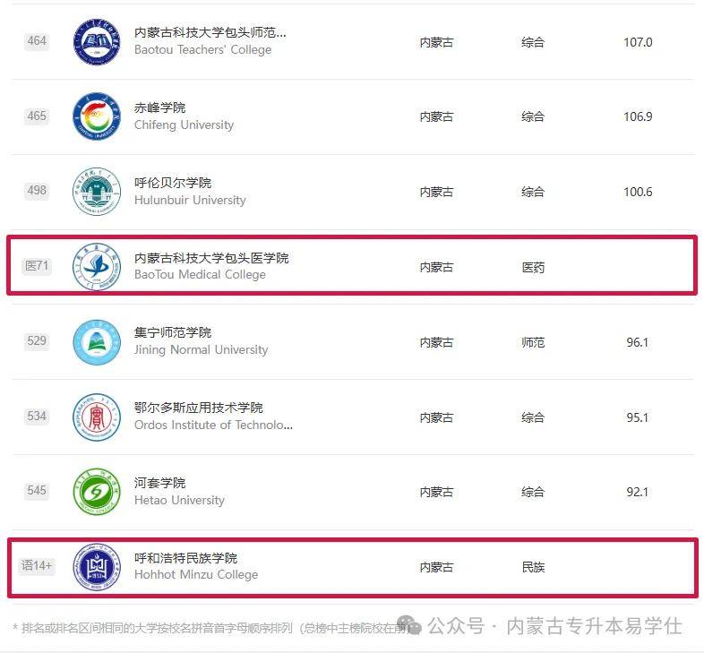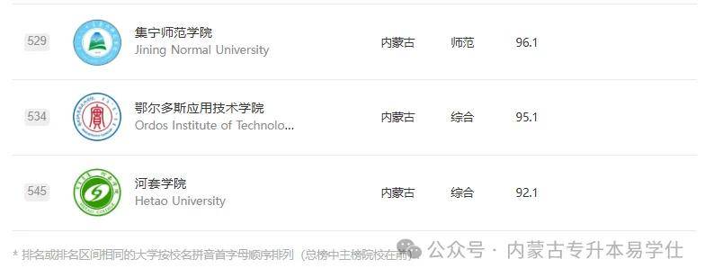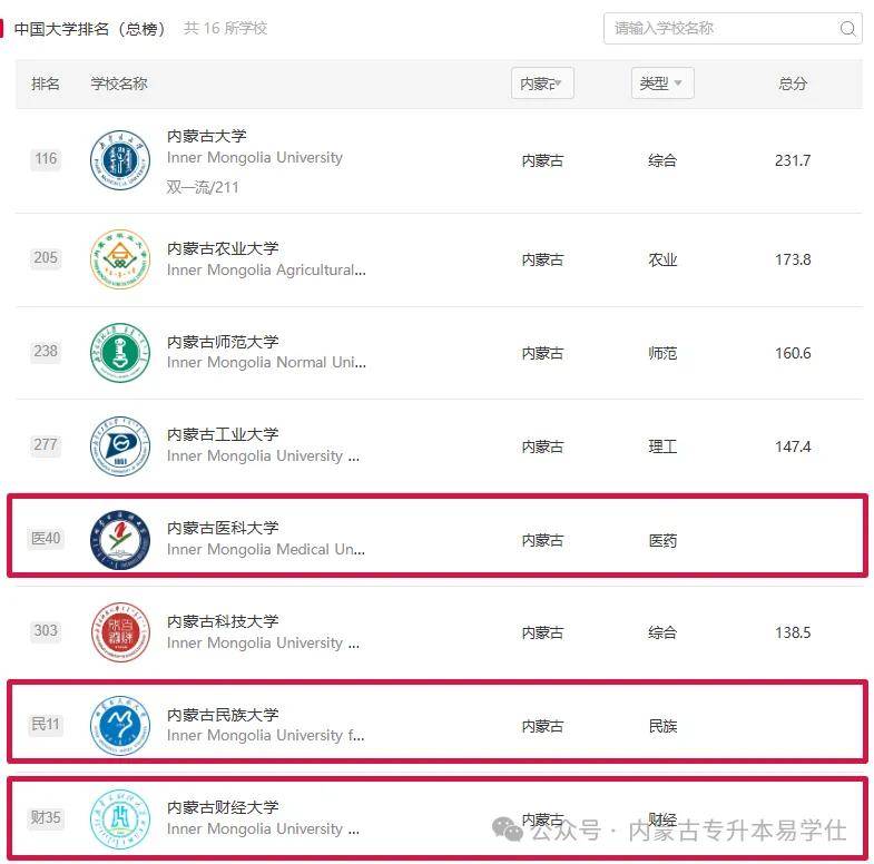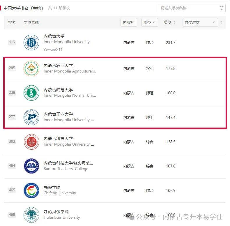 在软科2024年中国大学排名中,内蒙古大学【不参与专升本招生】排行第一,内蒙古农业大学排行第二,成为内蒙古专升本招生院校里的NO.1。