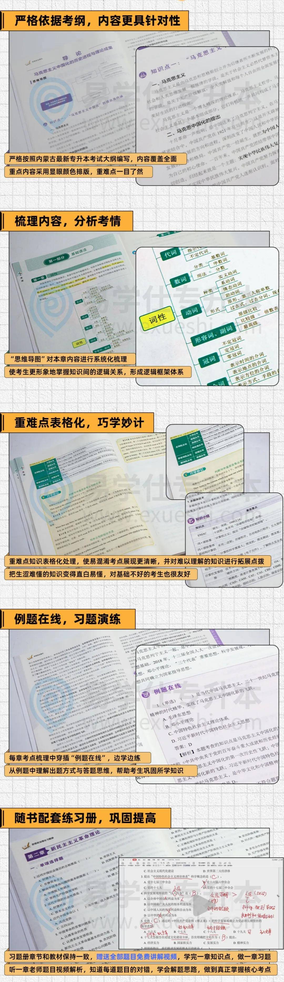 教材由深耕于专升本多年的易学仕老师编写,18年一线教学教研经验的结晶,严格按照最新考试大纲,对大纲所涉及的知识点进行了集中梳理,内容精炼、重点突出、深入浅出,可作为参加内蒙古专升本考试的复习备考用书。(用过的铁铁们都说好试试?)