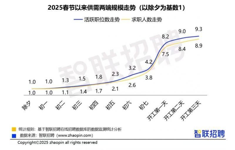 在供需两端规模走势上,活跃职位数和求职人数均呈现出上升趋势。特别是在正月初八开工第一天,两者分别跃升至除夕的8.2倍和7.5倍,环比前一天均实现翻倍,随后两天也保持上升态势。这表明,春招首周劳动力市场供需两端双增长,开启了满血状态。