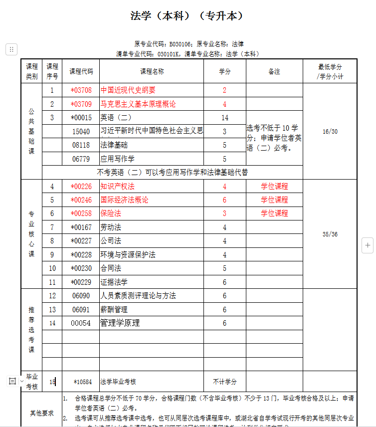 中南财经政法大学自考本科法学专业考试科目及要求: