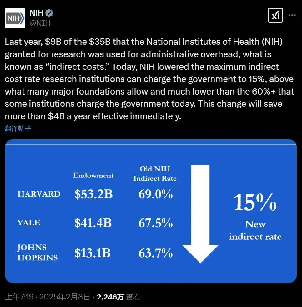 NIH在备忘录中强调:“美国需要保持全球顶尖的医学研究水平。为此,我们需要确保更多的资金用于科研项目本身,而非行政开支。”