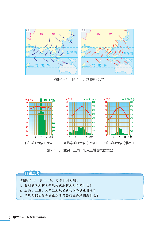 - **第七章 亚洲**:包括亚洲概述、东南亚、南亚、西亚、日本等内容。介绍亚洲是世界面积最大、跨纬度最广、东西距离最长的大洲,地形复杂多样,气候类型丰富,有复杂的自然环境和多样的人文特色。东南亚地处亚洲与大洋洲、太平洋与印度洋的“十字路口”,中南半岛山河相间、纵列分布,马来群岛多火山地震;南亚有独特的“南亚次大陆”,以热带季风气候为主,印度是重要代表国家;西亚位于“两洋三洲五海”之地,石油资源丰富。
