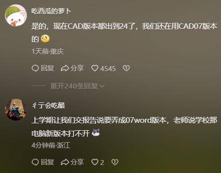 很多网友对此也是深有感触。有网友说现在 CAD 版本都出到 24 了,可学校里还在用 CAD07 版本。