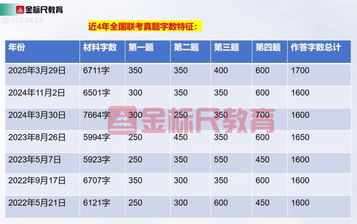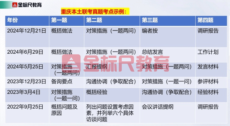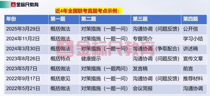 归纳分析近4年全国联考的试题之后,金标尺发现,全国联考出题的题型顺序较为稳定,常考的题型也比较稳定。具体情况如下:第一题基本上都是要素概括题;第二题主要是对策措施题,且大部分是一题一问;第三题主要是沟通协调题或公文写作;第四题主要是公文写作题。