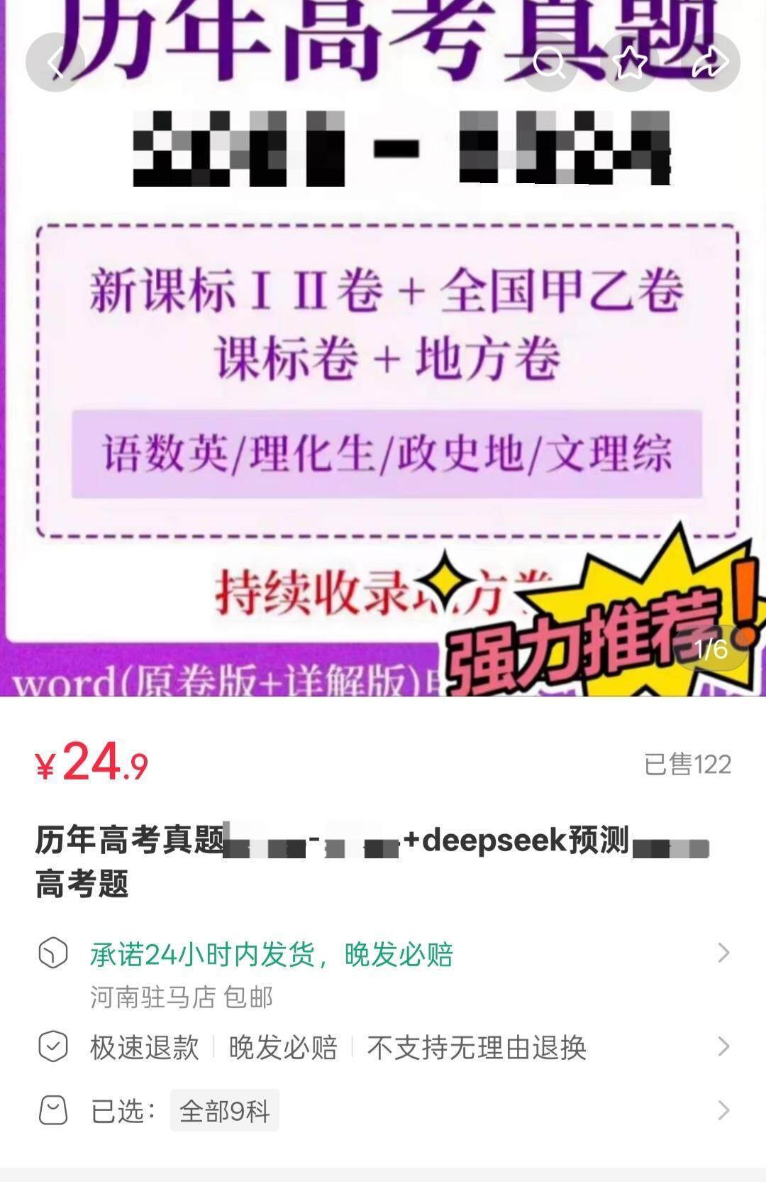 在社交平台与二手交易市场上,AI中高考押题话题热度颇高。有商家推出“历年高考真题+DeepSeek预测2025高考题”等商品套餐,商品销量轻松破百。还有商家宣称借助AI技术能快速生成出题内容和思路框架,甚至给出与去年真题“总体相似度达87.5%”的夸张结论。这些覆盖全学科的AI押题,搭配“大数据解析”“精准预判命题趋势”等话术,不断刺激着考生和家长的神经。
