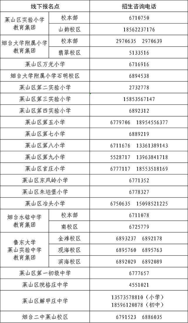 除特殊情况外,提倡家长选择线上报名方式。线下报名时请听从学校工作人员引导。线下报名点是线下报名信息登记、审核的场所,现场信息审验通过表示符合我区义务教育入学条件,录取结果不与报名点和报名顺序挂钩。线下报名仅审核登记新生信息,报名结束后数据统一导入“莱山区中小学智慧招生平台”进行后台审核录取。