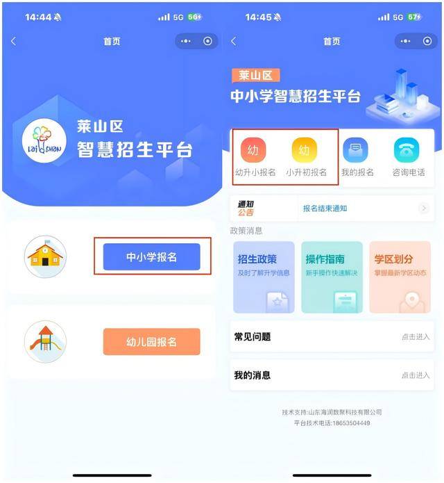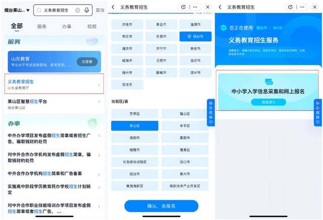 请您在“爱山东”APP注册信息并进行实名认证。登录后在“爱山东”APP检索“义务教育招生”并进入,在“烟台市”下面选择“莱山区”,进入“教育专区”,点击“中小学入学信息采集和网上服务”,进入平台首页。