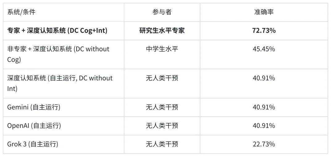 3. 交互是释放专家潜能的钥匙: 即使是 “深度认知” 系统,在没有人类交互的情况下自主运行时,其表现也仅与普通商业 AI 持平(40.91%)。