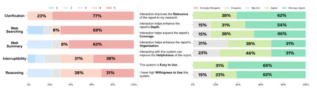 左图:专家用户针对专业领域科研问题,对最终报告质量的评分对比(本系统 vs Gemini/OpenAI/Grok);右图:各系统交互体验评分。