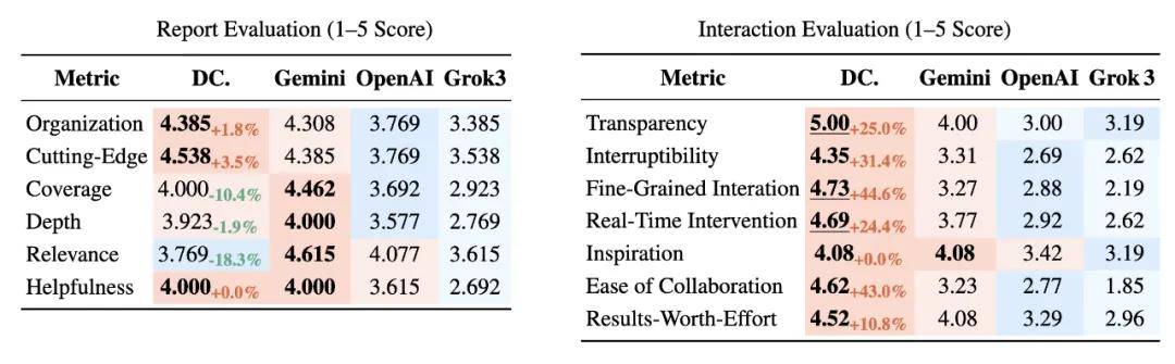 在与当前市场领先的商业深度研究系统(Gemini, OpenAI, Grok)的直接对比中,“深度认知” 系统同样展现出全面的优势。评估从两个维度展开:一是用户对最终报告质量的主观评分,二是用户对交互过程体验的评分 [1]。