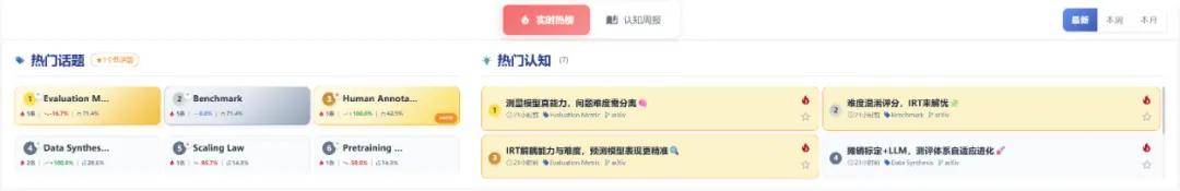 展示本周热门认知话题排行榜(如评估指标、基准测试、人工标注等)以及社区学习动态总结
