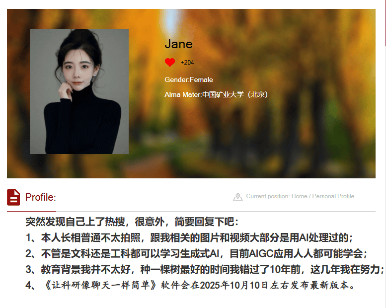 从本科到博士后,她的求学路径虽非一开始就聚焦顶尖名校,却每一步都走得扎实,而跨学科的背景,从资源学到地球科学,再到新闻传播与人工智能,反而让她在AIGC与科技治理的交叉领域有了独特优势。