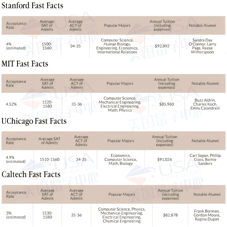 但在美本申请人眼里,斯坦福大学、麻省理工学院、芝加哥大学、加州理工学院尽管没有“藤校”之名,学术实力却不在8大藤校之下。