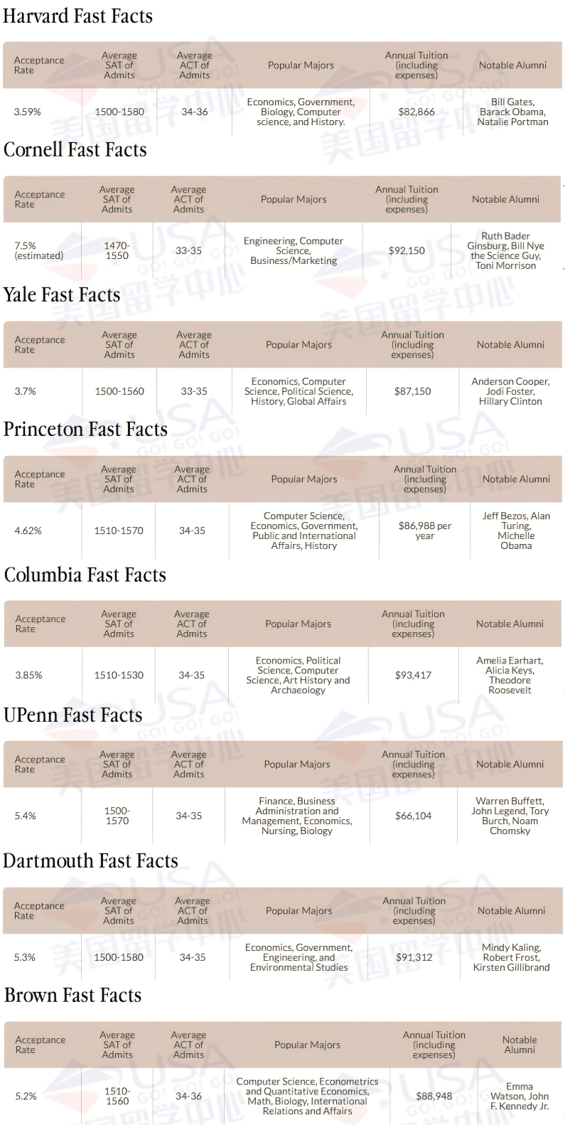 哈佛大学、耶鲁大学、普林斯顿大学、哥伦比亚大学、宾夕法尼亚大学、达特茅斯大学、布朗大学和康奈尔大学。
