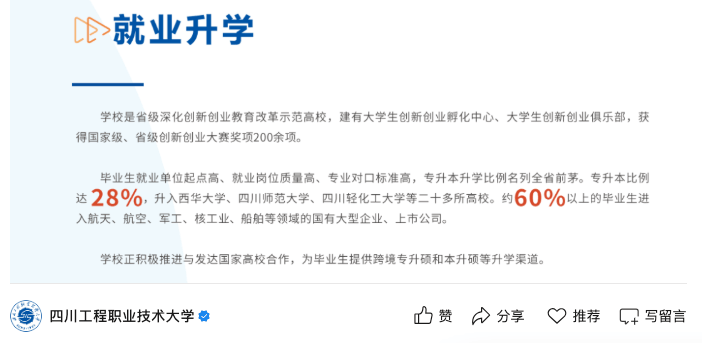 四川工程职业技术大学亦是如此,学校最新发布的就业数据显示,毕业生有60%以上都能进入航空航天、军工、核工业、船舶等领域的国有大型企业和上市公司就业!