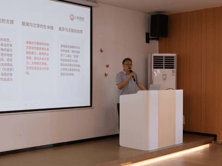 在讲座中,陈泰湧老师还聚焦当下新媒体环境的新课题:“信息碎片化容易导致‘断章取义’,比如一则新闻被截取片段传播,可能偏离原意;AI生成内容虽高效,但存在‘事实虚构’风险,比如错误关联人物与事件。”他提醒在场师生:“新闻创作者要建立‘信息核查流程’,对AI生成的内容必须逐点验证;文学创作者则要警惕‘为猎奇而脱离现实’,虚构需服务于主题表达,而非单纯追求新奇。”