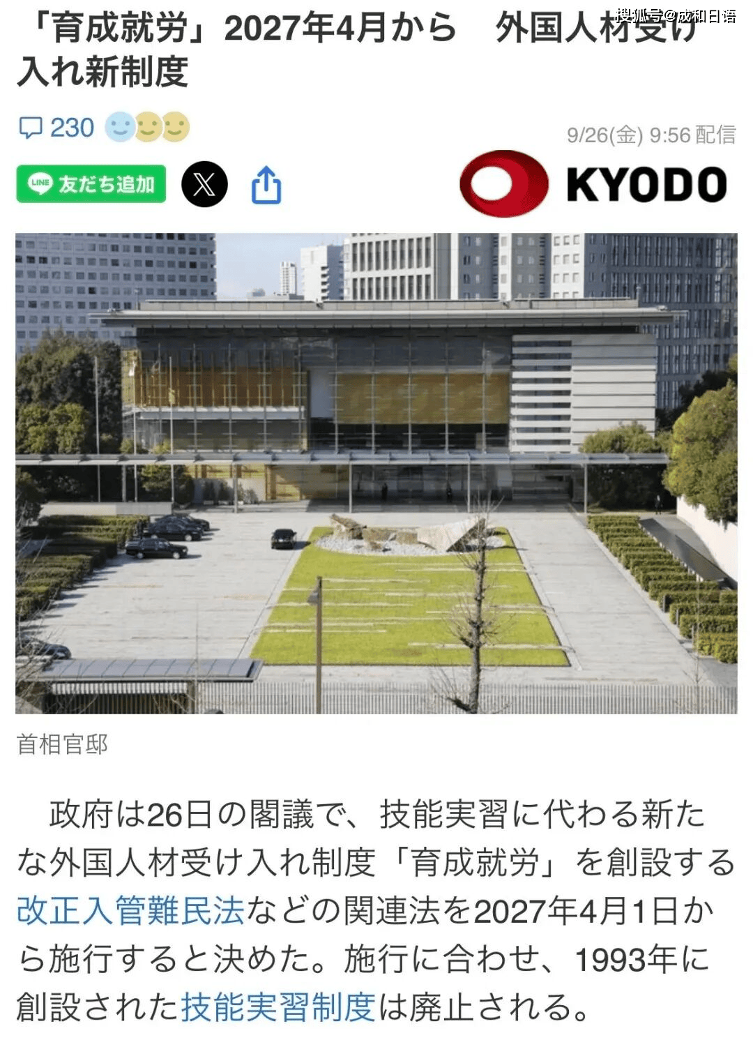 在9月26日的内阁会议上,日本正式决定从2027年4月1日起,彻底废除停止自1993年就开始实施了22年的技能实习制度,同时推出全新的育成就劳制度来取代并接收外国劳动力。