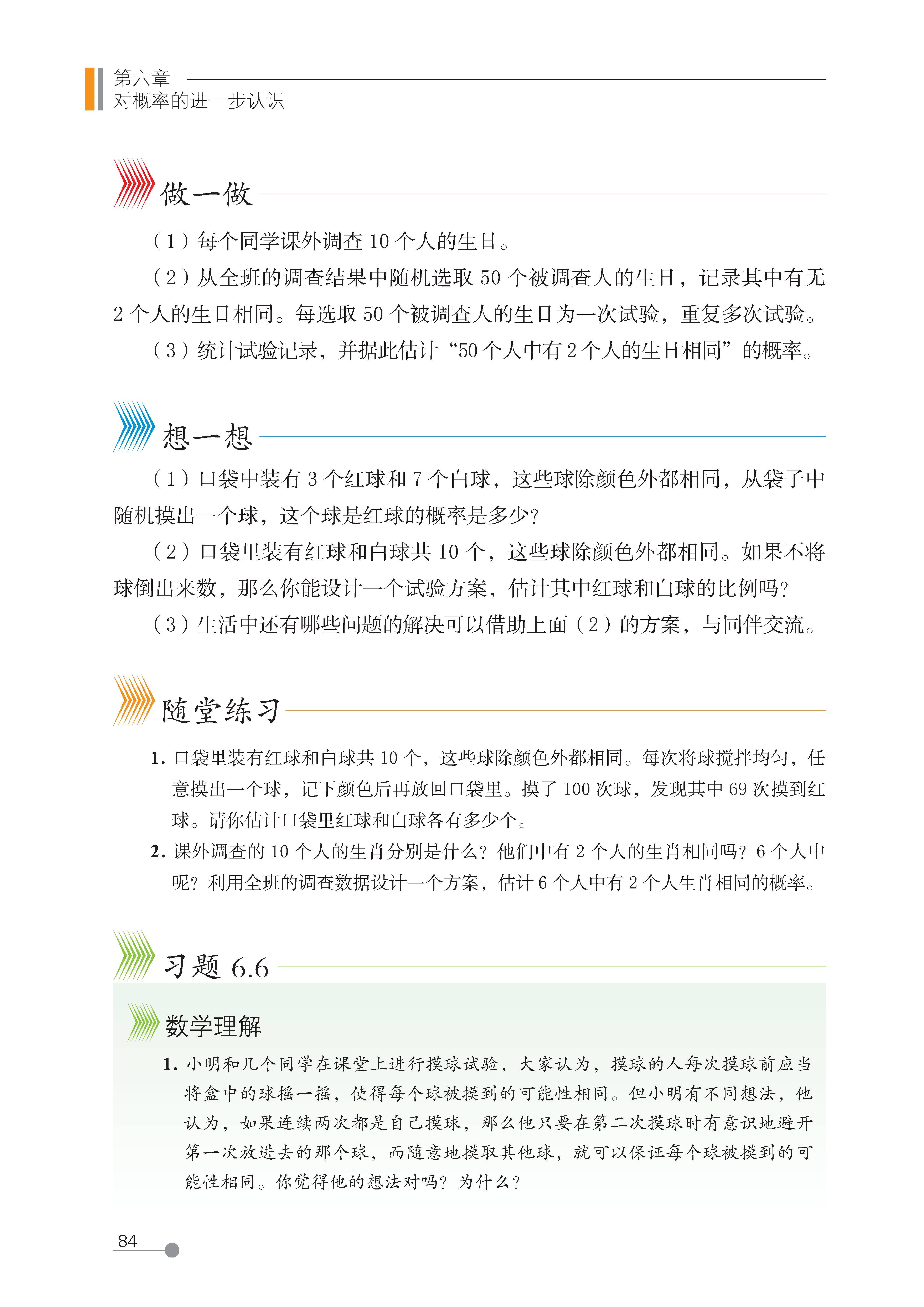 2. “统计活动 —— 视力的变化”:用统计知识解决 “现实问题”该主题要求学生完整经历 “统计探究流程”:设计调查问卷(如 “不同年级学生的用眼时间、视力数据”)→ 收集数据(班级 / 年级抽样)→ 整理数据(绘制条形图 / 折线图 / 扇形图)→ 分析数据(发现 “视力下降与用眼时间的关联”)→ 提出建议(如 “合理安排屏幕使用时间”)。教学意义:衔接八年级 “数据的分析”(平均数、中位数、统计图)和九年级 “用频率估计概率” 的知识,让学生体会 “统计不是简单的画图计算”,而是通过数据收集与分析,发现现实问题(如青少年视力下降趋势)、为解决问题提供依据(如向学校提出 “课间护眼建议”),培养 “数据观念” 和 “社会责任感”。