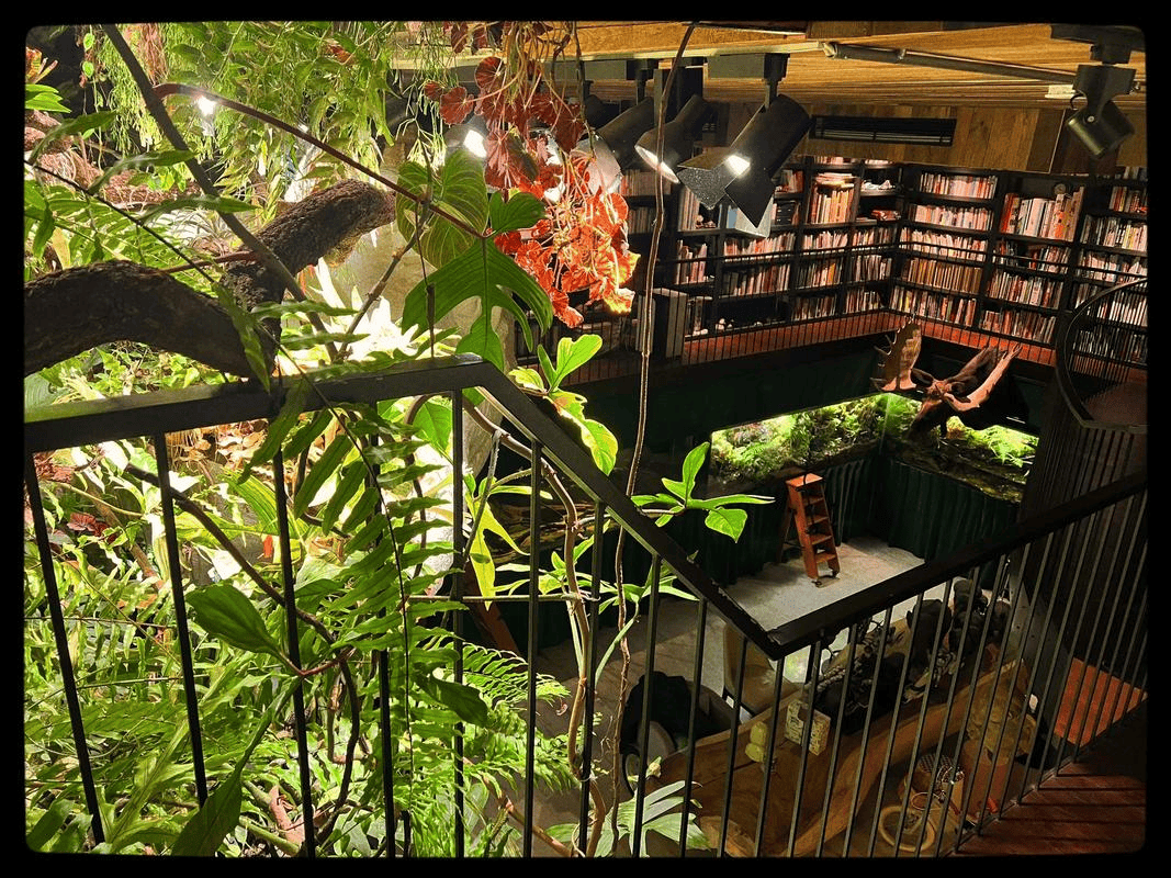 他的庭院被打造得如同热带雨林, 流水潺潺,小鸭嬉戏,各种植物和谐共生。从热带雨林植物到高寒地区植物,从高空飞鸟到海底珊瑚,应有尽有。