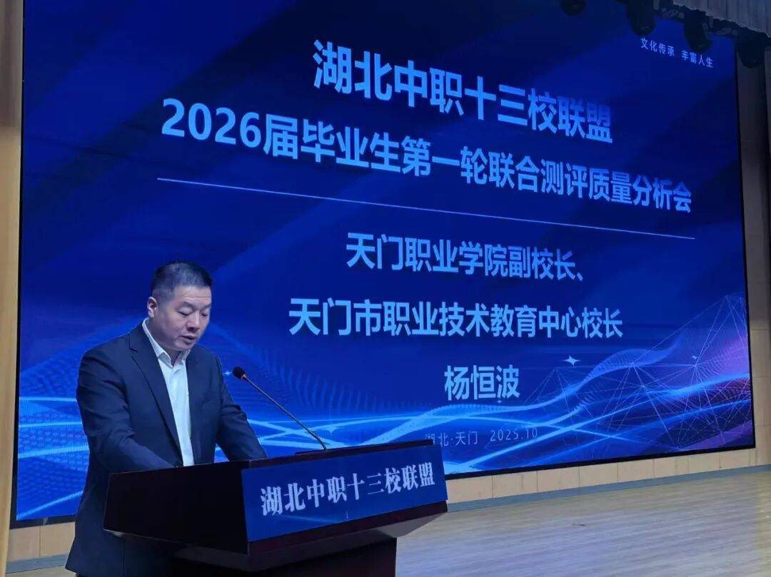 金秋送爽,硕果初绽。10月11日上午8时30分,湖北中职十三校联盟2026届毕业生第一轮联合评测质量分析会在天门市职业技术教育中心学术报告厅成功举行。作为本次会议承办方,学校以“深化校际协作、共促质量提升”为核心,携手联盟成员校与特邀单位,共同为中职教育高质量发展与毕业生升学就业赋能。