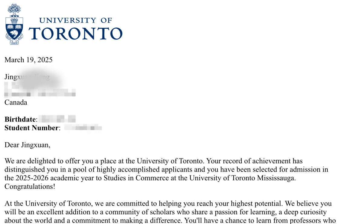 多伦多大学→姜同学获商科与社科双录取