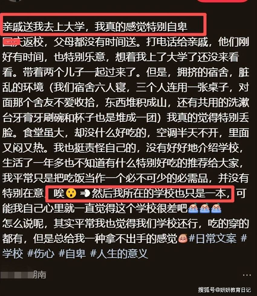 他们来到这个学校,并不会因为宿舍环境差,就觉得这个孩子不优秀,只会觉得一本大学生还是被亏待了。