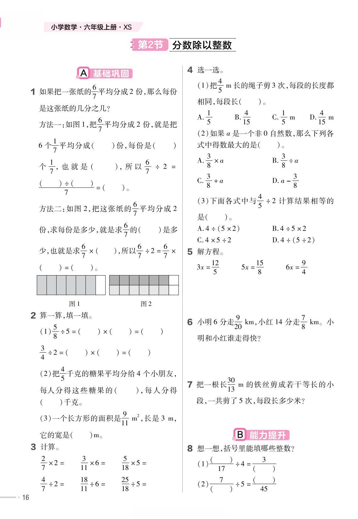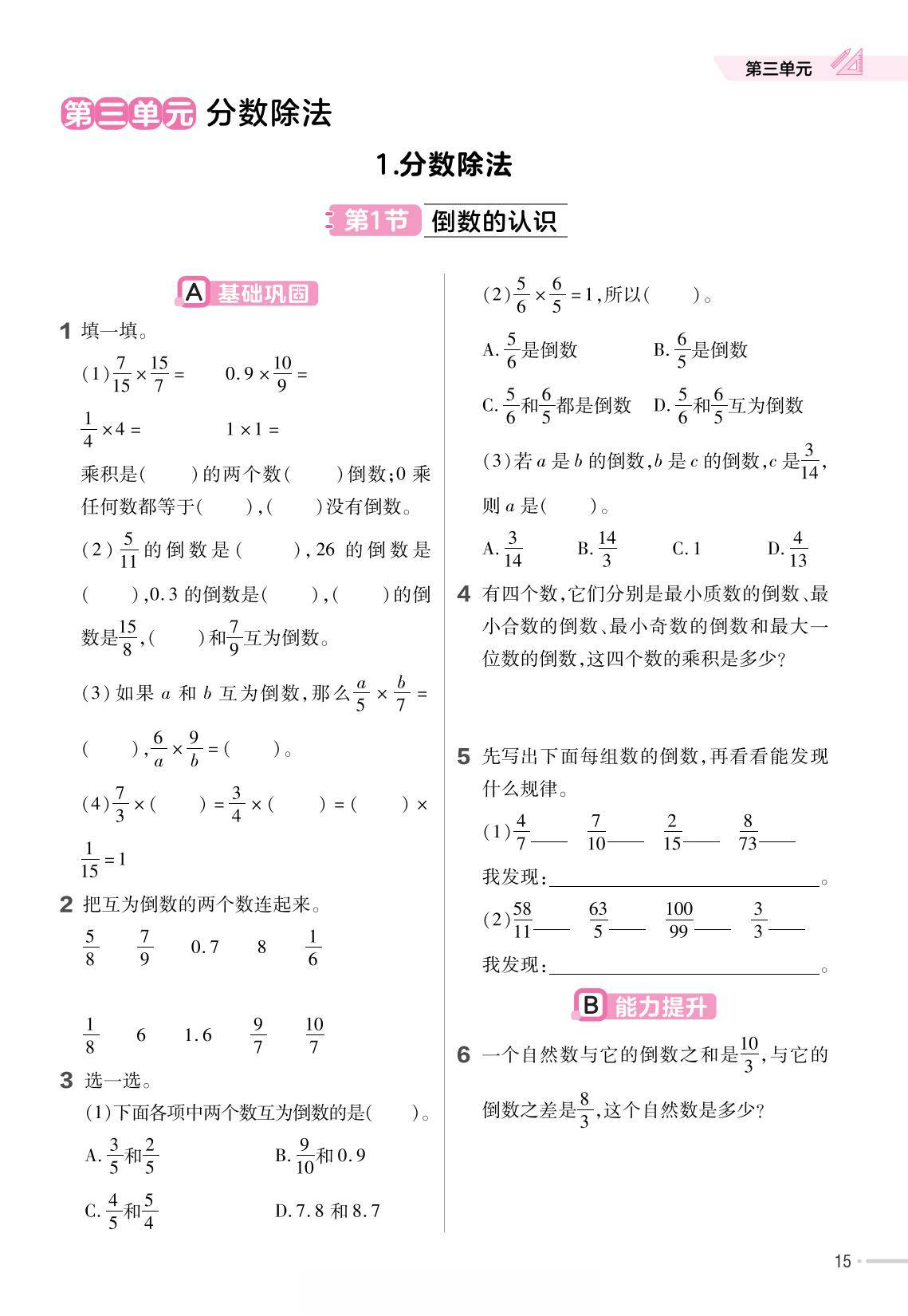 在涵盖的方面,涉及数学概念(倒数)、计算方法(分数除法的各种情况)、运算顺序(分数连除和乘除混合运算)以及实际应用(用分数除法解决问题)等。从基础的概念理解,到复杂的混合运算,再到实际问题的解决,全面覆盖了分数除法这一单元的核心知识点,既注重知识的传授,也强调技能的训练和应用能力的培养。