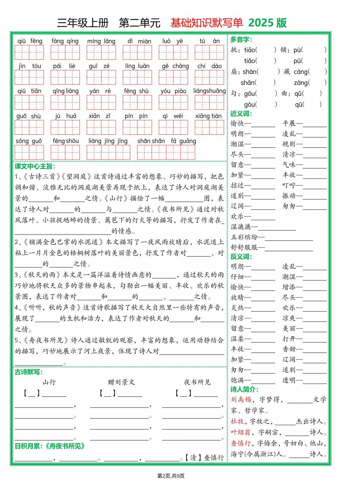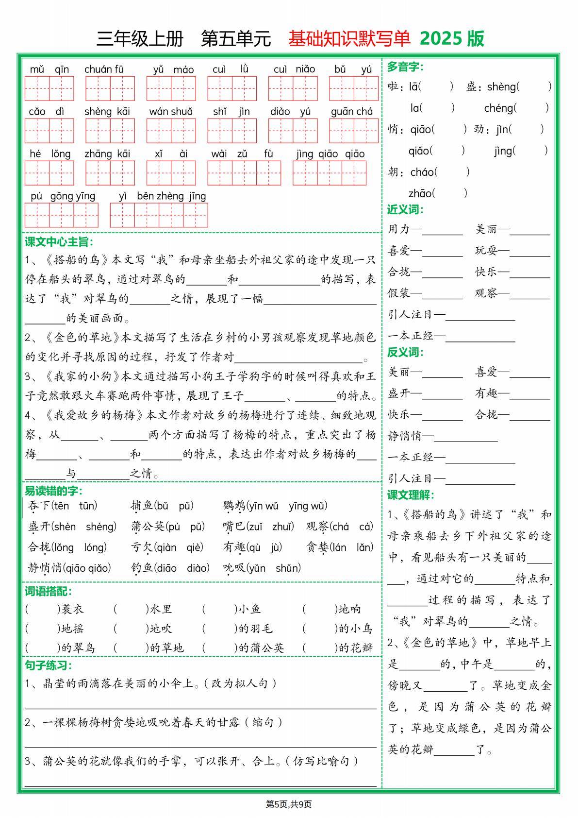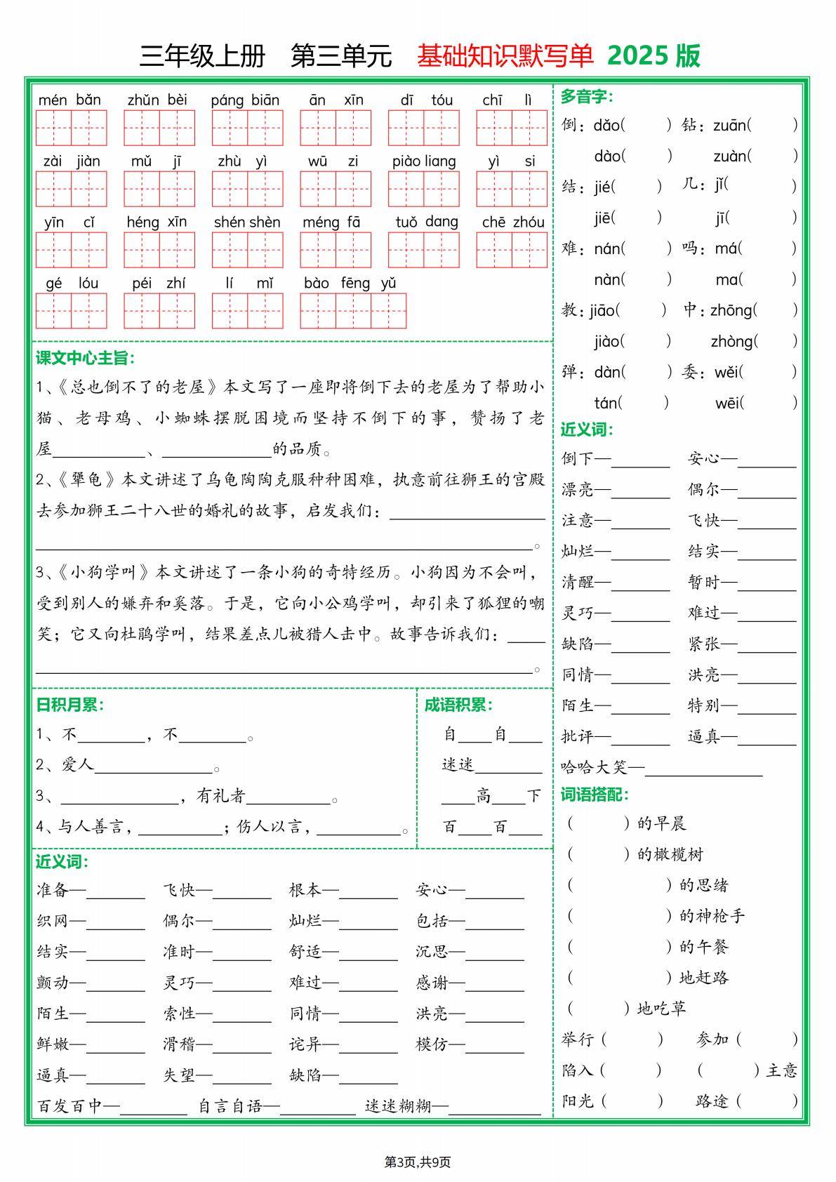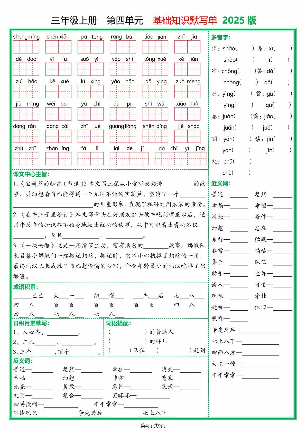 今天为大家分享:25新三上语文1-8单元基础知识默写单(含答案18页),在涵盖的方面上,涉及语文基础知识的字词、拼音,课文理解的主旨把握,以及语言运用的成语、词语搭配、句子仿写等,从基础到运用,多维度覆盖语文学习要点。生字词默写能让学生扎实掌握汉字的书写与认读,打好语文基础。