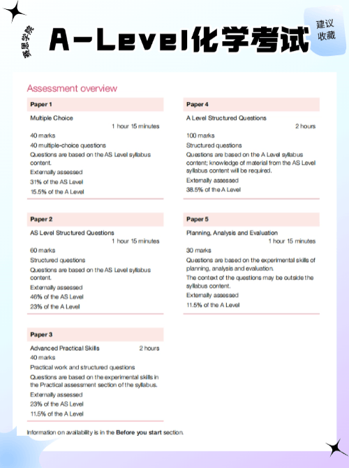 A-Level化学考试有5张试卷,AS考生考Paper 1、Paper 2和Paper 3,A2考生考Paper 4和Paper 5,最大的挑战就是【有机化学】,常见的考点包括有机反应,绘制所有有机物之间的转换路线等。