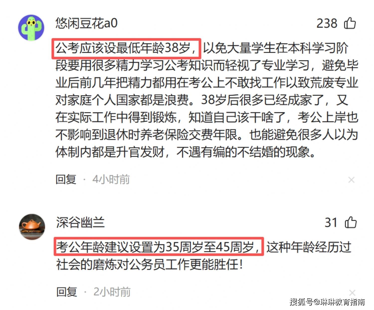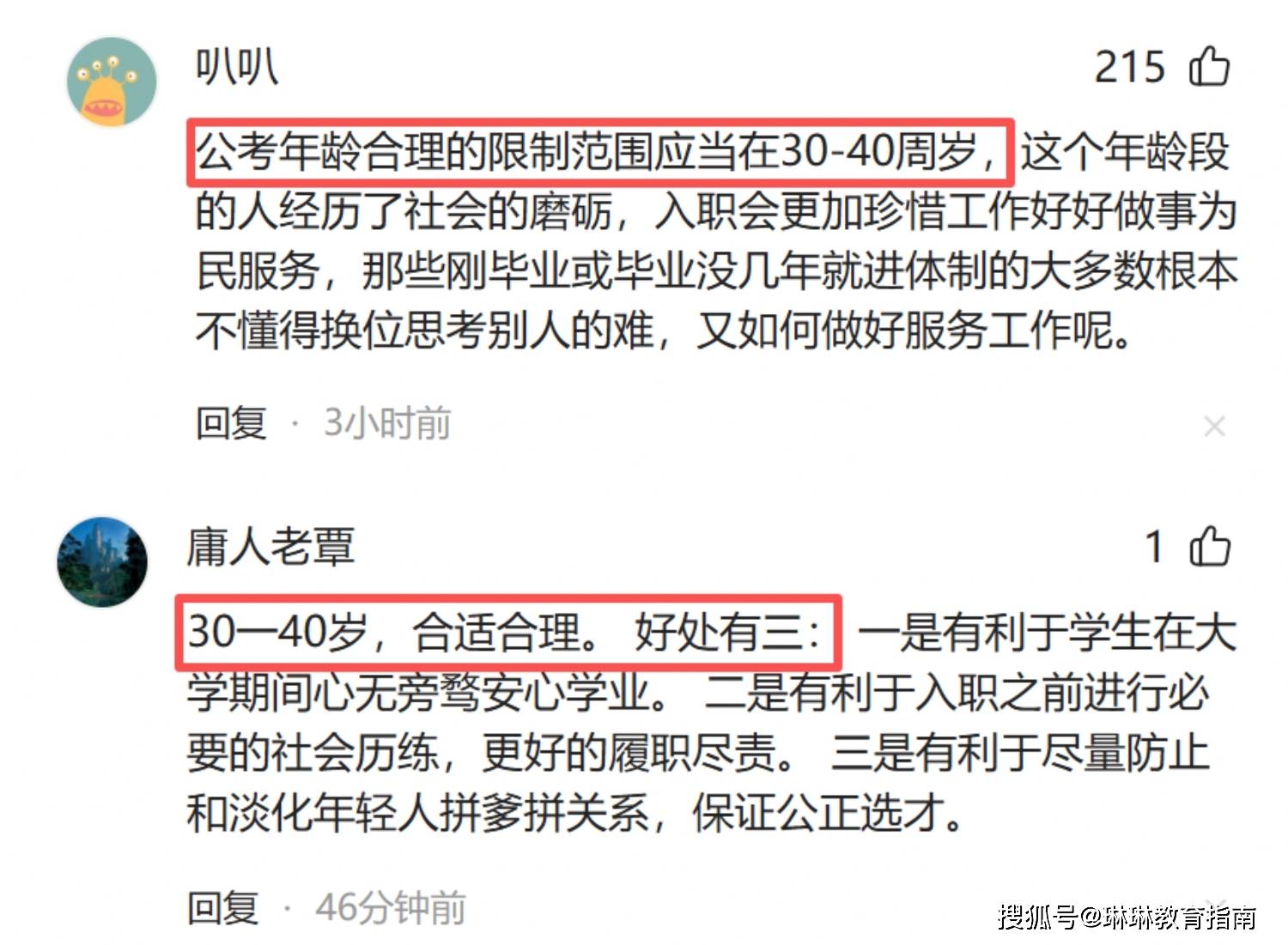 评论区有一位网友指出:“公考年龄合理的限制范围应当在30-40周岁,这个年龄段的人经历了社会的磨砺,入职会更加珍惜工作好好做事为民服务,那些刚毕业或毕业没几年就进体制的大多数根本不懂得换位思考别人的难,又如何做好服务工作呢?”
