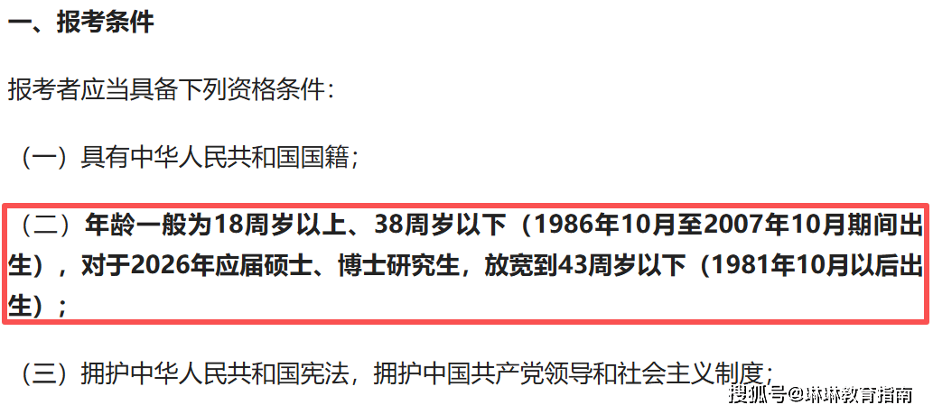 2026年国考报考年龄条件有所调整,普通考生年龄要求为18周岁以上、38周岁以下,即1986年10月至2007年10月期间出生的人员;2026年应届硕士、博士研究生则进一步放宽至43周岁以下,即1981年10月以后出生的人员可以报考。