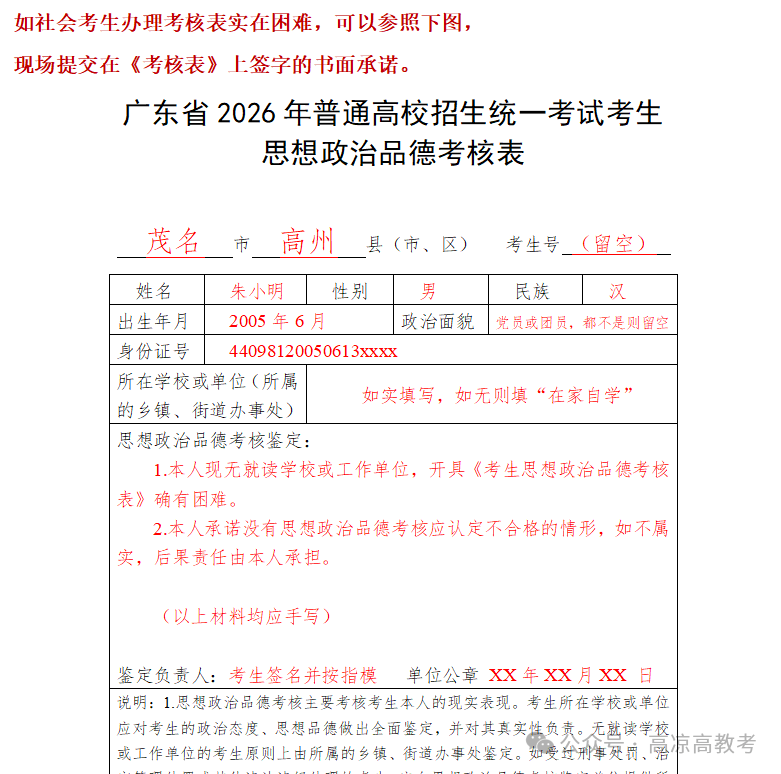 近日,有报考点(高州教育局)发布了考核表的办理以及填写说明,如果社会考生无就读学校或工作单位,办理考核表有困难的,可填写书面承诺并签名。