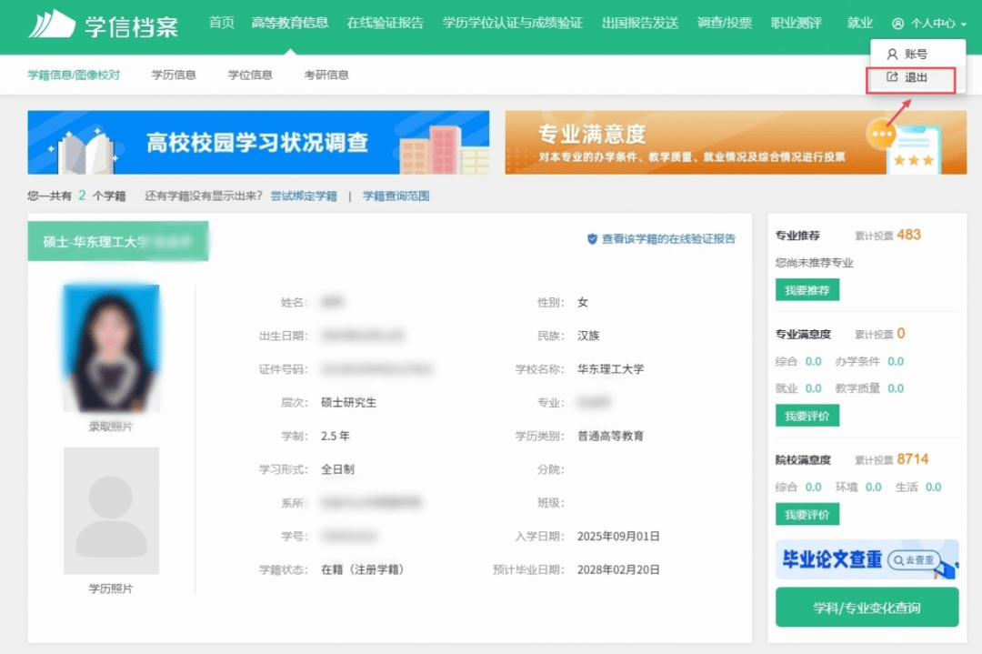 信息核对无误后,点击右上角退出登录,完成学籍信息自查。
