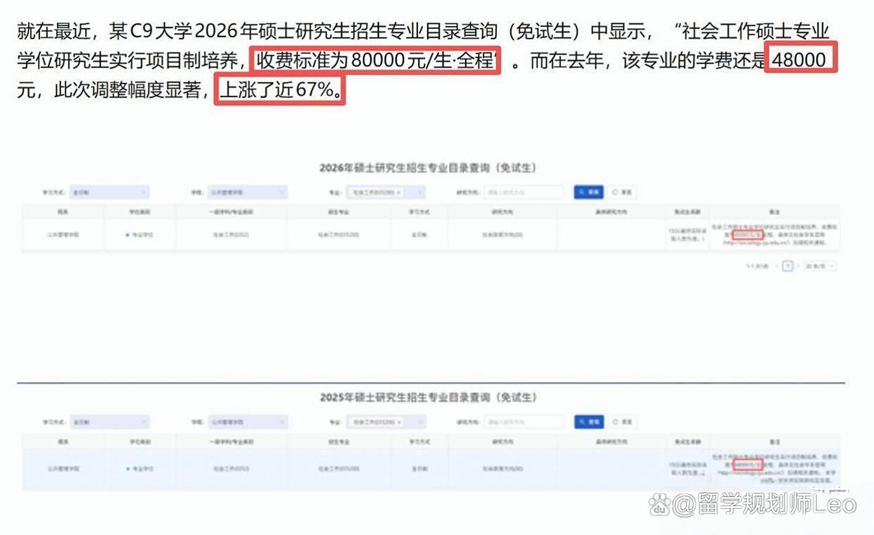 某C9大学的社会工作硕士专业,学费从去年的4.8万一跃到8万,全程上涨近67%。