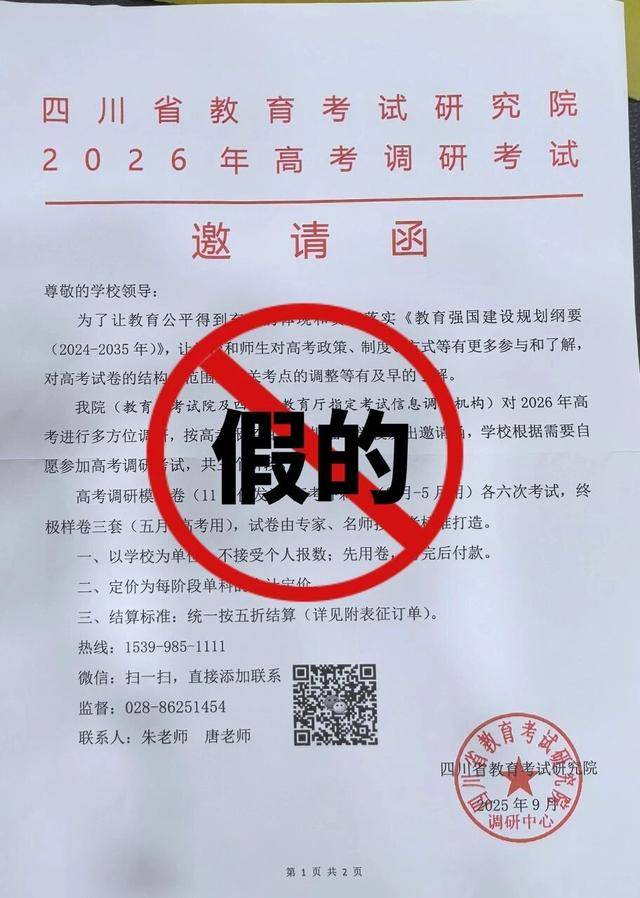 近日,有群众反映,收到以“四川省教育考试研究院”名义发出的《2026年高考调研考试邀请函》,函件中该单位自称是“教育部考试院及四川省教育厅指定考试信息调研机构”,将针对2026年高考开展多方位调研,并邀请学校根据需要自愿参加“高考调研模拟考试”。