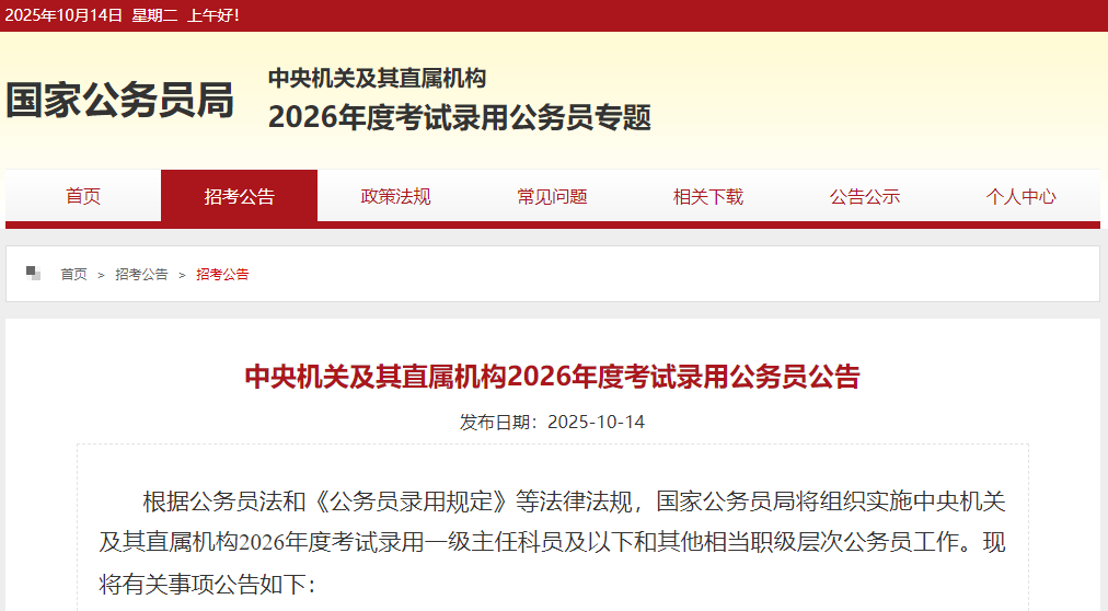 中央机关及其直属机构2026年度考试录用公务员公告