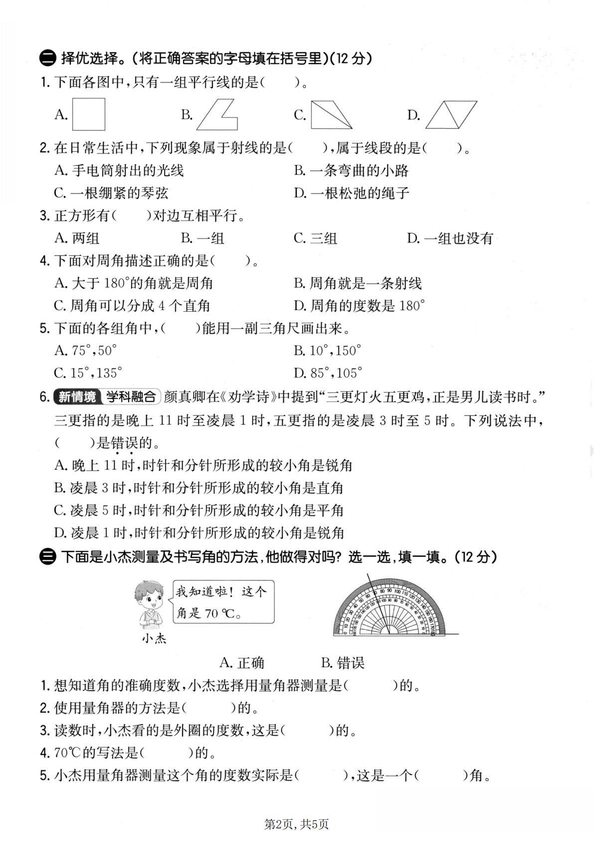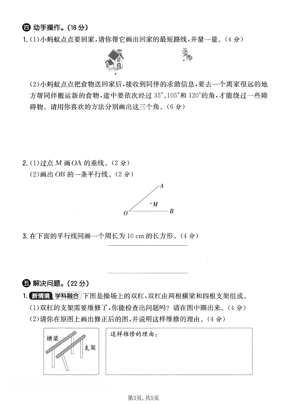选择部分考查了含有平行线的图形判断,射线、线段的生活实例,正方形对边平行组数,周角的正确描述,用三角尺能画出的角,还有不同时刻时针和分针形成角的类型判断;操作部分有测量角的方法判断、画最短路线、画指定度数的角、画垂线和平行线、在平行线间画指定周长的长方形;解决问题部分则结合双杠支架维修,考查垂直知识在实际中的应用。