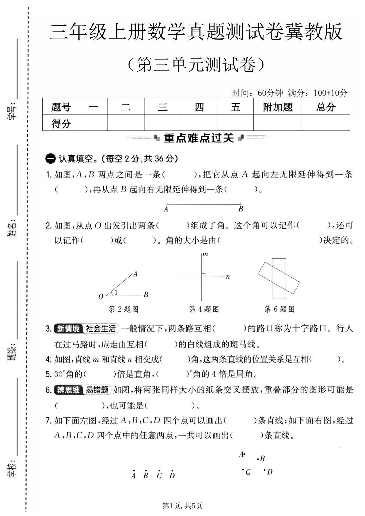 今天为大家分享:三年级(上)冀教版数学第三单元真题测试卷3,包含填空、选择、操作、解决问题等多种题型,全面考查线与角的相关知识。从涵盖内容来看,填空部分涉及线段、射线、直线的概念与延伸,角的组成、表示及大小决定因素,生活中直线的垂直与平行现象,特殊角(直角、周角)与已知角的倍数关系,纸条交叉重叠部分的图形,以及经过点画直线的数量等。