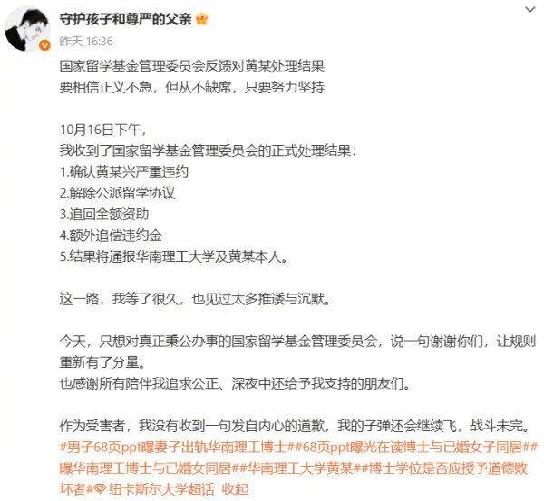 10月16日,张先生在微博发布消息称:国家留学基金管理委员会已正式处理此事,认定黄某兴存在“严重违约”行为,决定解除公派留学资格,追回全额资助并追加违约金。