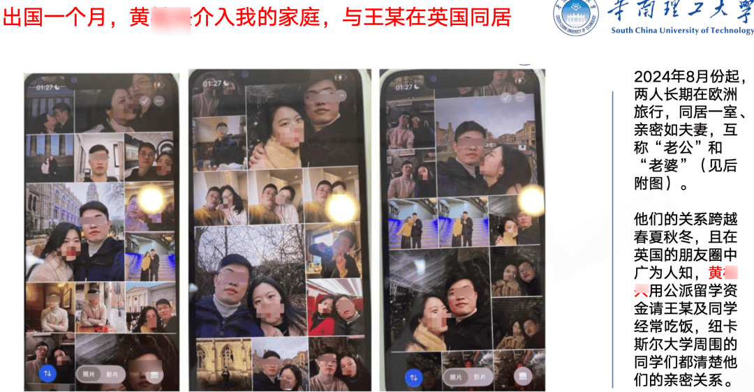 PPT中包含照片、聊天记录、病历截图等细节:两人在英国期间频繁外出、亲密合影;2025年回国后,还在广州、杭州多地连续十多天同居。